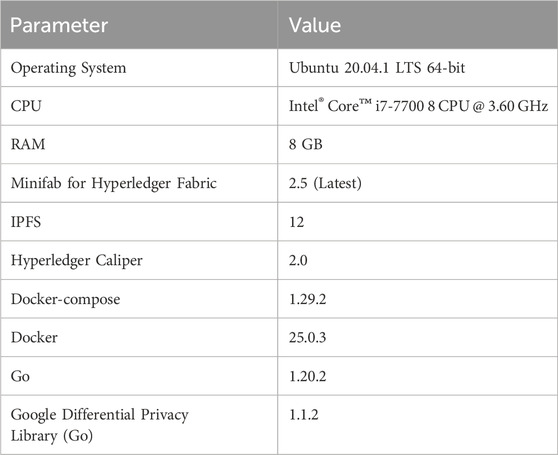 In the proposed system, the implementation environment is carefully chosen for optimal performance and compatibility. The system runs on Ubuntu 20.04.1 LTS 64-bit, ensuring security and reliability. It uses an Intel® Core™ i7-7700 processor with 8 CPUs at 3.60 GHz and 8 GB of RAM, balancing high processing power with cost-effectiveness. The environment uses Minifab for Hyperledger Fabric 2.5 for up-to-date blockchain features and security. IPFS version 12 supports decentralized storage, enhancing data availability. Hyperledger Caliper 2.0 benchmarks blockchain performance, providing insights into transaction throughput and latency. Docker and Docker-compose (versions 25.0.3 and 1.29.2) facilitate containerization for scalable and isolated service execution. Go version 1.20.2 is chosen for efficient system-level programming. This configuration supports robust, scalable, and efficient blockchain application testing and deployment.