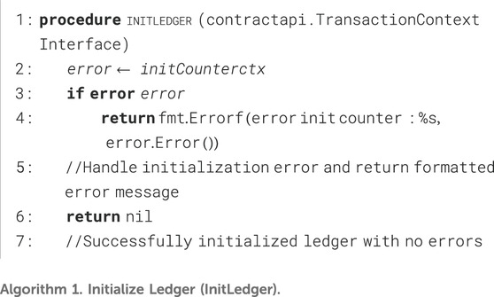 Algorithm 1 describes the implementation of the Initialize Ledger (InitLedger) smart contract algorithm on the HLF network. The algorithm accepts a single input, ctx, an instance of contractapi. TransactionContextInterface. This algorithm aims to initialize the ledger by calling the initCounter function, which maintains the counter’s initial state in the ledger. If the initialization is successful, the algorithm returns nil, indicating that the ledger was properly initialized. If an error occurs during the initialization procedure, the algorithm will output an error message for the type of error init counter:%s. This architecture guarantees that any errors during ledger startup are identified and reported.