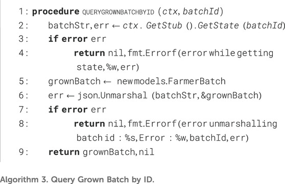 This transaction refers to querying and retrieving information related to batches that have grown or evolved over time. In a supply chain, this involves querying the status or details of rubber batches that have accumulated over time due to increasing quantities or shipments. Algorithm 3 presented represents the operation of the QueryGrownBatchById function within a smart contract, used to retrieve and process a batch of data from a blockchain network. Initially, the function attempts to fetch the batch data from the blockchain’s state database using the ctx. GetStub(). GetState method. If an error occurs, such as the absence of data or a network issue, the function returns an error formatted to indicate a failure in data retrieval. Assuming successful data fetch, the next step involves deserializing the string format data into a FarmerBatch object for programmatic manipulation. If errors arise during this unmarshalling, such as from data corruption or incorrect formatting, the function returns an error that includes the specific batch ID and a detailed failure message. If unmarshalling is successful, the function returns the structured FarmerBatch object with a nil error, indicating successful execution.