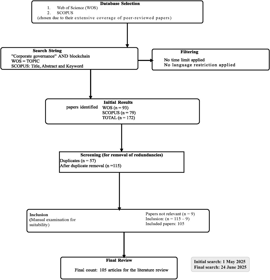 This study employs two literature review structures for the analysis of the dataset. This was done to achieve the objectives of this research. The dataset in this regard refers to the total number of publications analysed and reviewed by this research. These two literature review formats include (1) a systematic literature review to synthesise existing studies on integrating blockchain in corporate governance, and (2) a bibliometric literature analysis to examine the overview of the datasets. For the systematic literature review, this study followed the Preferred Reporting Items for Systematic Reviews and Meta-Analyses (PRISMA) process. This aims to provide a comprehensive analysis of the dataset (the prior literature) by analysing the content, context, and trends in this field. Using bibliometric analysis, this study used metrics such as the number of citations, the number of publications, and the year of publication, and authors for analysis, such as citations, highly cited articles, highly productive journals, and publishers. Metrics such as keywords and authors were used for visualisation, which include co-occurrence, co-authorship, and emerging themes.