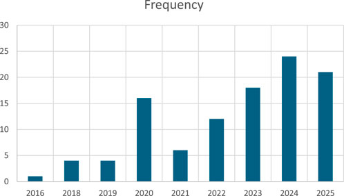 The observed constant growth in publications thereafter might suggest a growth stage, yet this interpretation warrants caution. Moreover, the absence of longitudinal studies limits our ability to assess whether this trend reflects substantial progress or merely hype-driven proliferation. This gap indicates the need for more empirical studies to be conducted on the inclusion of blockchain technologies in various dimensions of corporate governance.