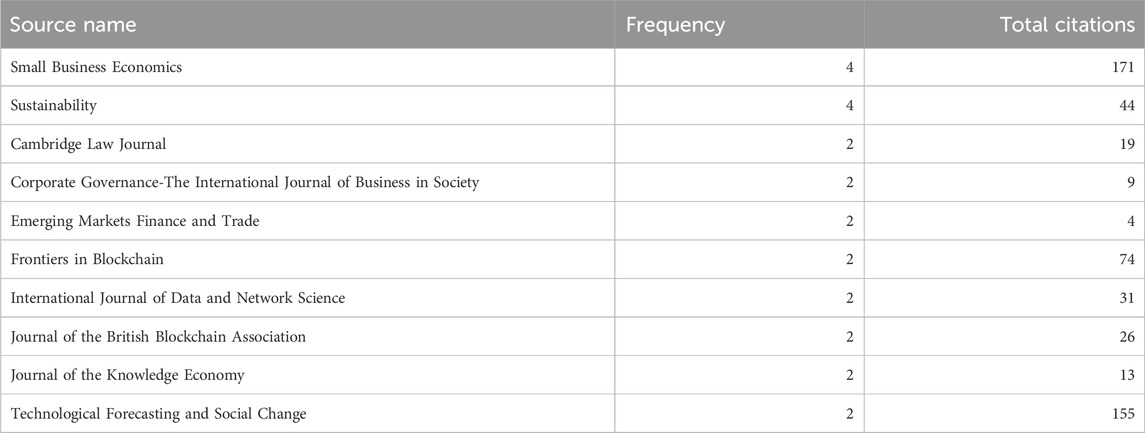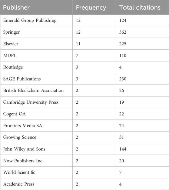This study evaluated the most productive publishers by analysing the sources of articles within the dataset using Harzing’s Publish or Perish and Microsoft Excel. The results revealed that Emerald Group Publishing and Springer were the top publishers, leading in publication frequency. Additionally, Table 2 presents the citations accrued by these publishers, providing valuable insights for researchers interested in publishing on blockchain and corporate governance topics. A critical lens reveals potential biases, that is, the dominance of Western publishers (e.g., Emerald, Springer), which may translate that most research comes from high-income environments. Potentially, this can indicate that emerging market contexts may have limited representation in research output. This geographic concentration challenges the diversity claim and suggests a need for broader sourcing, a point that can be explored in future research.