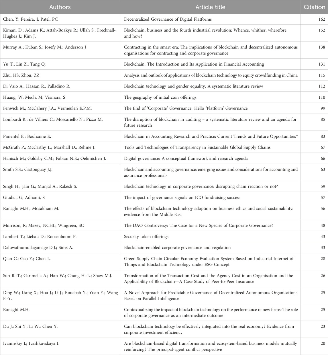This study evaluated article productivity using total citations as a metric, based on two datasets. Duplicates were removed during data cleaning by retaining the higher-cited version from Web of Science or Scopus. The analysis found “Decentralised Governance of Digital Platforms” (Chen et al., 2021) to be the most cited article, with 162 citations. Table 3 presents the papers with more than 20 citations. While these highly cited works provide a foundation for blockchain integration in corporate governance, their prominence raises critical issues: Does citation frequency reflect quality or merely network effects within established academic circles? While productivity may be based on quality, beyond that, as indicated in the trend in publication (as explained earlier), given that the literature landscape is emerging and few works have found the foundation of the topic, productivity may also be based on the availability of research works. Moreover, future studies can read these relevant, productive articles for a more in-depth understanding of the topic.