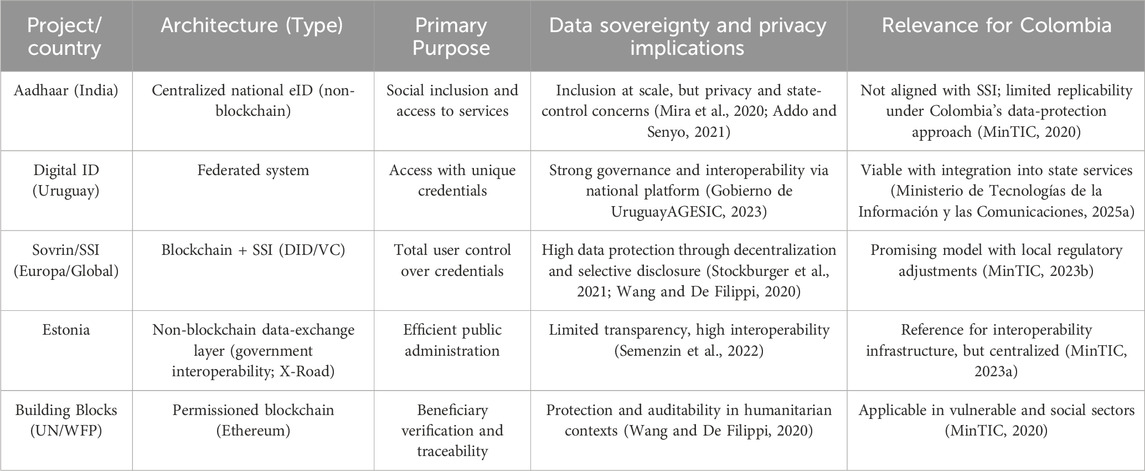 International experiences in digital identity point to convergent design principles: minimal data on-chain, robust revocation, and standardized verifiability. These principles are transferable to Colombia because they are consistent with the country’s legal and policy frameworks on digital identity and public services. Reference implementations and policy trajectories in the European Digital Identity initiative and regional programs illustrate feasibility at scale (Table 1), while the high failure rates documented in digital government projects underscore the need to close the design–implementation gap through governance and evaluation (Baheer et al., 2020; European Commission, 2025; Gobierno de UruguayAGESIC, 2023).