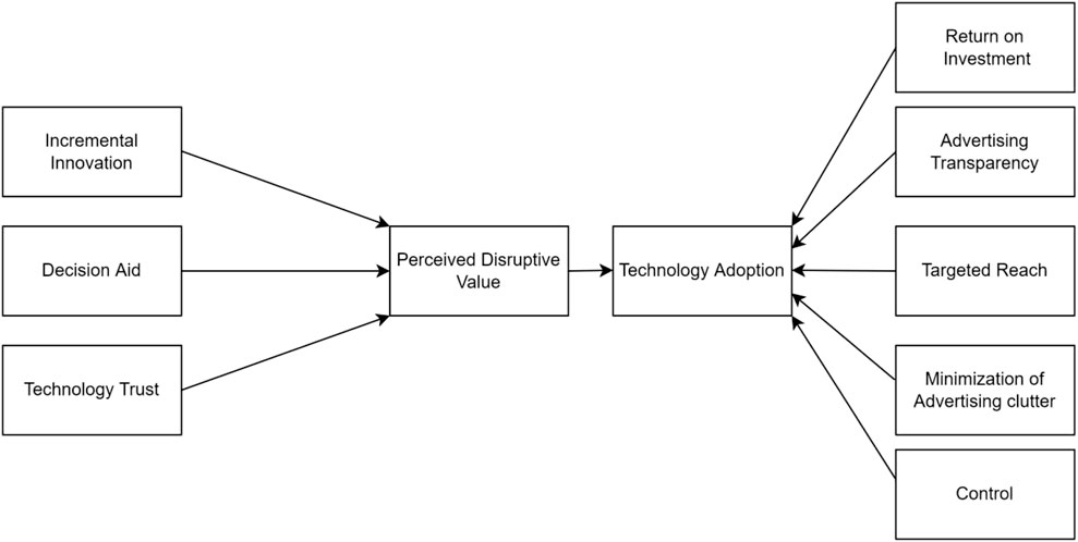 Results: Findings reveal that incremental innovation, decision aid, and technology trust significantly influence perceived disruptive value, which in turn correlates positively with technology adoption. Minimizing advertising clutter and improving control and transparency emerged as key adoption factors.