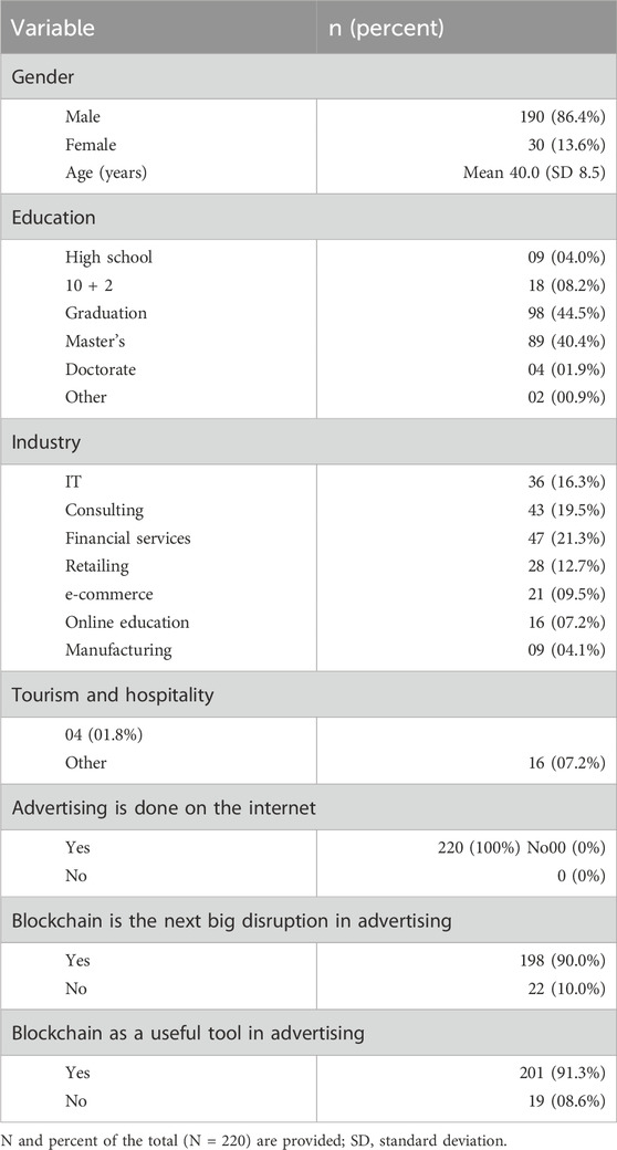 The data were collected using a structured questionnaire from 220 firms that used technology and advertised their products on any digital platform. Firms that did not use digital technology to promote their products/services were not included in the survey. The data were collected between January 2022 and May 2022 in the union territory (UT) of Jammu and Kashmir in India. The questionnaire was pretested, and a pilot study was conducted to validate the instrument. The data were collected from the organizations’ managerial staff having direct knowledge about the organizational functioning and a role in the firm’s decision making. Section 1 collected the data about the demographic attributes of the employees of the firm they work for and the sector to which the firm belonged. It also included some basic questions regarding advertising. Section 2 of the questionnaire had the items about the perceived disruptive value of the blockchain technology in terms of it being an incremental advancement to existing technology used by the organization. It also included items regarding blockchain technology’s importance as a managerial decision aid and a trusted technology in terms of transparency. The items were curated to capture the firm’s response in terms of it being an advertising disruption on the three variables: incremental innovation, decision aid, and transparency. The rationale for using the three variables can be traced in the literature, which points to the three being the most important factors when an organization embraces new technology. If organizations fail to see any incremental value in an emerging technology, they infer no decision making value, find it devoid of trust, and see the technology as having no disruptive value.