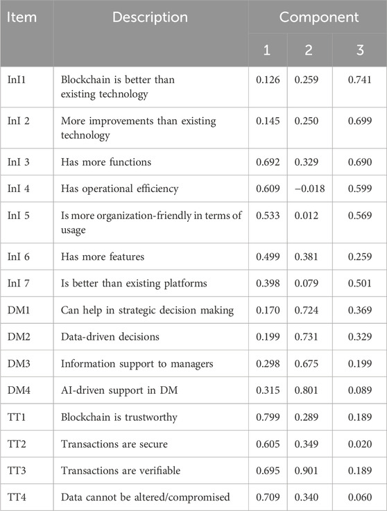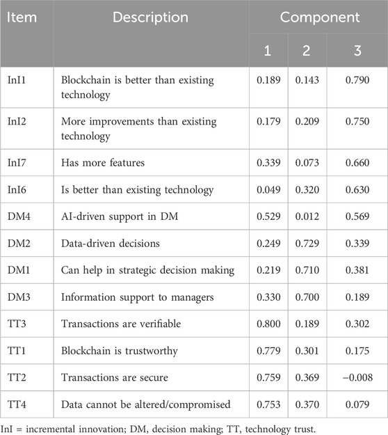 Table 2. Rotated component matrix: perceived strategic importance of blockchain technology (incremental innovation, decision aid to managers, technology trust).