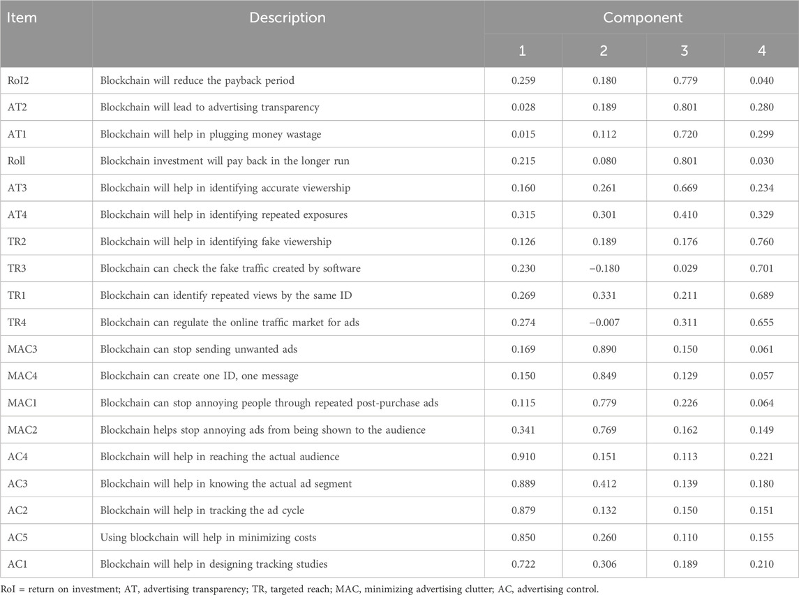 Questions regarding knowledge about blockchain were also assessed using part one of the questionnaires. Most of the managers were found to know about blockchain technology, and the firms studied used digital media for advertising. The dataset for the perceived disruptive value of blockchain technology was suitable for factor analysis. More than 95% of correlations were greater than 0.3, and no partial correlations were greater than 0.7. The largest partial correlation was 0.609, well below the threshold of 0.7. The KMO–Bartlett test of sphericity was also found to be significant, with the KMO measure of sample adequacy being 0.939, considered well within the statistical merits.