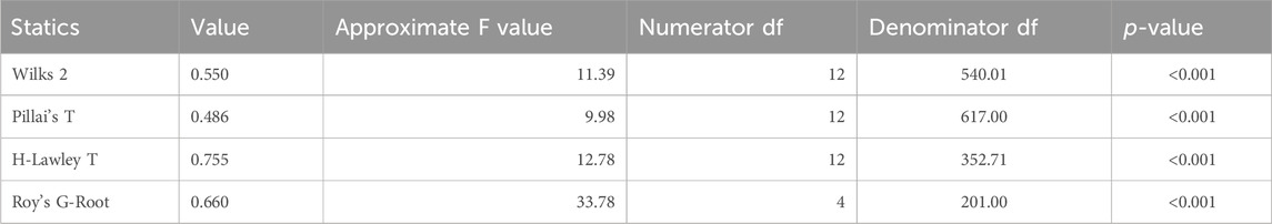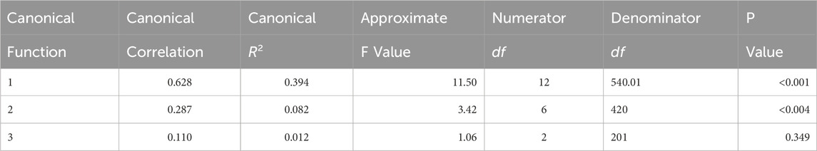 Canonical correlation analysis was employed as it allows simultaneous examination of multiple dependent and independent variables, making it suitable for exploratory studies linking perception-based constructs with adoption outcomes. The results of the canonical correlation are given in Table 5, which suggests the three significant functions. The first canonical function explains 39.4% of the variance, which is moderate; the findings should be interpreted with caution and seen as an initial exploration of blockchain’s perceived disruptive value rather than a fully predictive model. Moreover, the consecutive tests shown in Table 6 indicate that the three functions are jointly substantial. The canonical R2 values from Table 5 show that the first canonical function (Perceived Disruptive Value) explains 39.4% of the variance. The second and third canonical functions explain 8.2% and 1.2%, respectively.