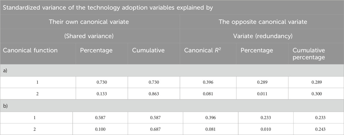 Table 7. Redundancy analysis of perceived disruptive value and technology adoption standardized variance of the program data vector (PDV) variables explained by a) own canonical variate and b) opposite canonical variate.