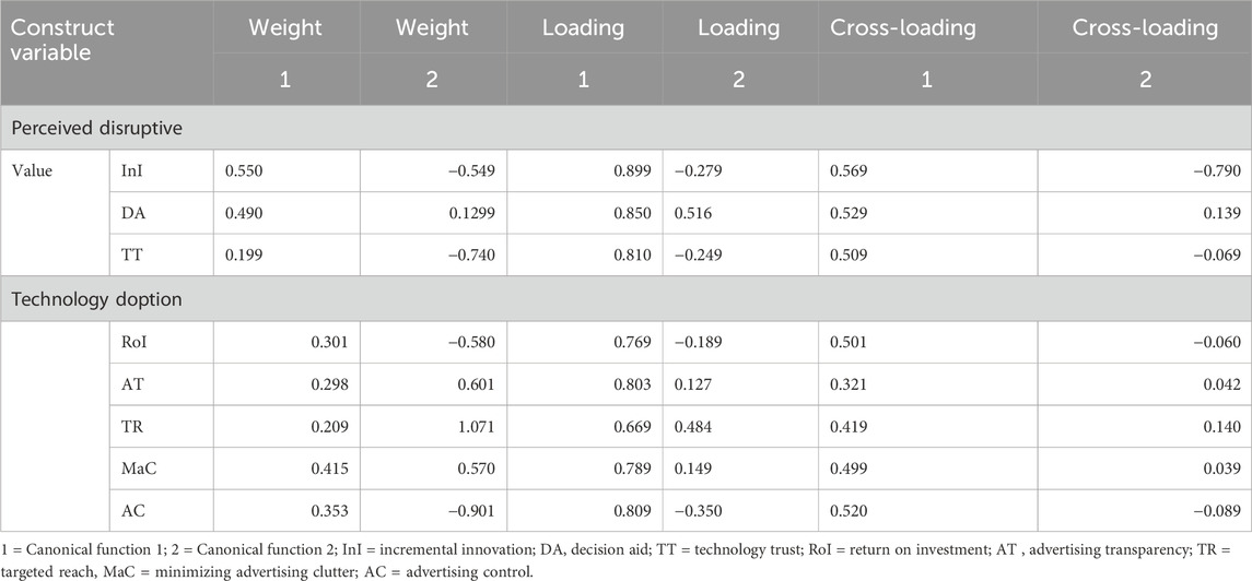 The two remaining were retained for redundancy. The redundancy values of Perceived Disruptive Value and Technology Adoption are found to be low at 0.290 and 0.209, respectively (see Table 7). This can be ascribed to the low value of canonical R2. The total of two canonical functions is 0.520. The first canonical function is considered for the interpretation because it explains approximately 97% of the variance, against 3% by the second canonical function.