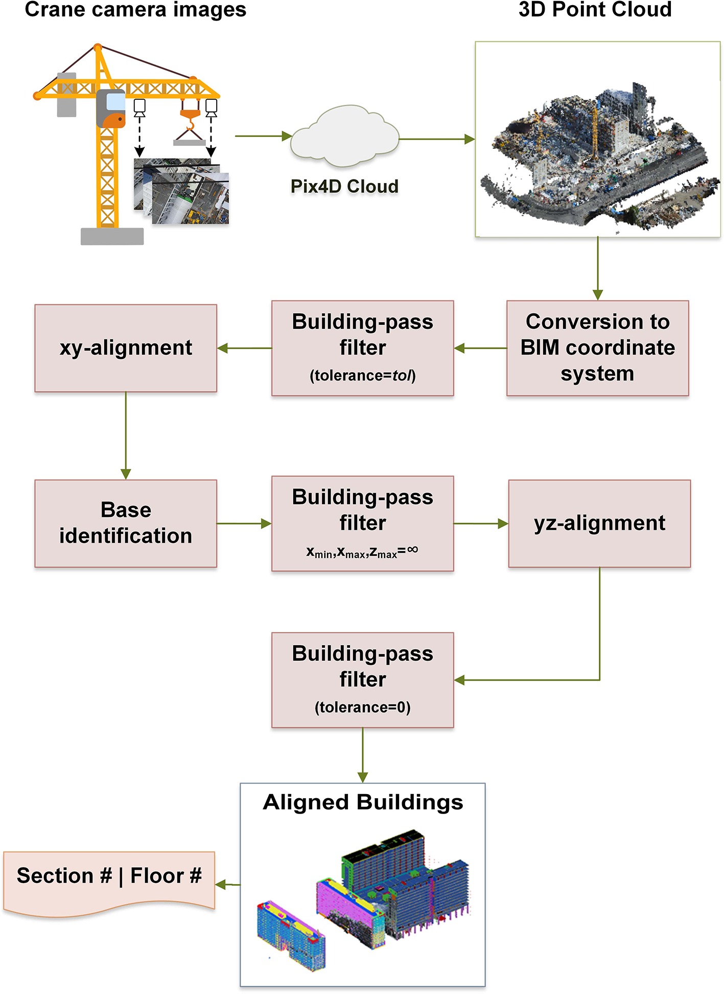 In order to achieve good alignment, the non-building noise must be eliminated. Following this, the best-captured building can be used to obtain the necessary transformations for alignment. Then, the base of the buildings (which may be occluded) must be identified. Finally, the building point clouds must be aligned with the BIM model. Once this is achieved, the current floor under construction can be inferred from the aligned cloud. In the next section, we present our method of achieving these objectives in light of these requirements.