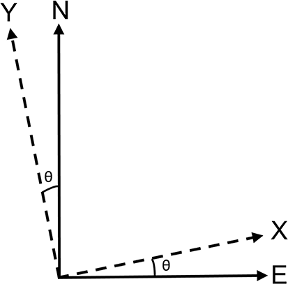 The location data in the as-built point clouds is in terms of global coordinates defined by the Universal Transvers Mercator (UTM) system for zone 35 V, also known as ETRS-TM35FIN (Uikkanen, n.d.). UTM coordinates consist of easting and northing values (E, N). The BIM model is defined in terms of local (X, Y, Z) coordinates. The axes of the local coordinate system are selected so as to follow nearby streets and outer-wall directions of buildings. The zero point for the BIM model is set to be in the South-West direction from the site area, thus giving positive X and Y coordinate values for all locations on the site. Let's refer to this zero point, expressed in UTM coordinates, as (E0, N0). The height value Z is the same for both local and global coordinates and it follows the N2000 coordinate system, which expresses the height from the theoretical sea level mean height. Local X and Y coordinate axes differ by θ = 11.4° from the global E and N axes, as is illustrated in Figure 3. Both the global zero point and angular offset were obtained at the start of the project (from the architect and site drawing, respectively), after which we were able to apply the conversion to all point clouds without any manual intervention.
