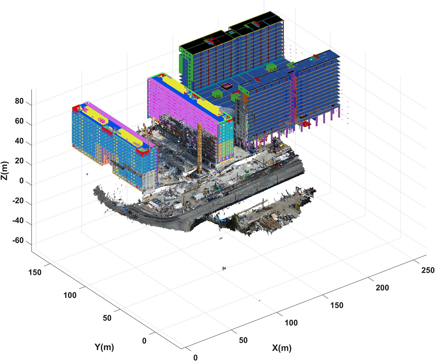 reality capture, multi-building point cloud, building extraction, BIM model, construction site, crane cameras