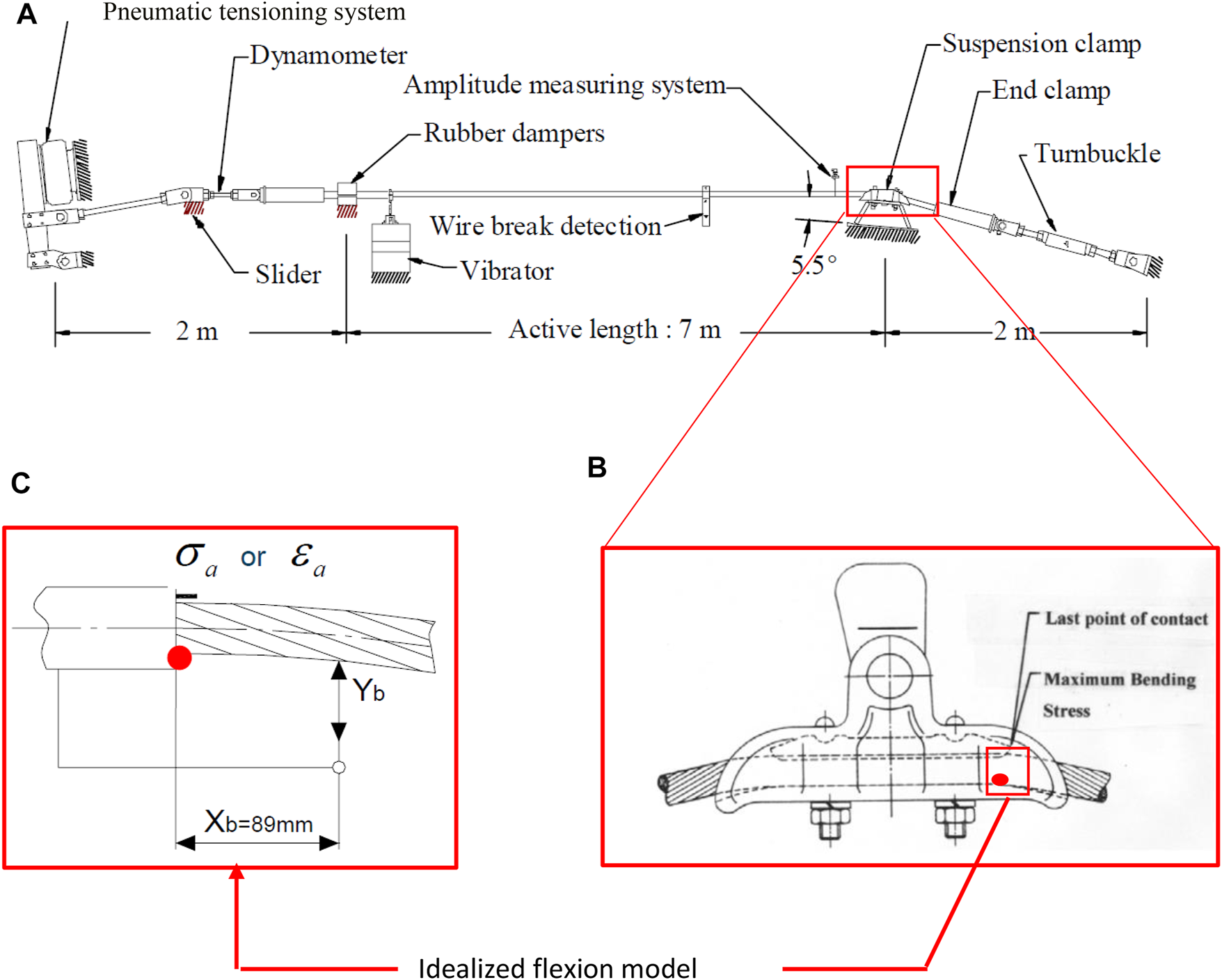 (A) Fatigue testing bench for conductor-clamp systems [adapted from (CIGRE, 2010)]. (B) Conductor-clamp assembly showing region of maximum bending stress (Cloutier and Lalonde, 2007). (C) Simplified representation of the conductor-clamp assembly and the idealized stress or strain induced by bending amplitude Yb (Cloutier and Lalonde, 2007).