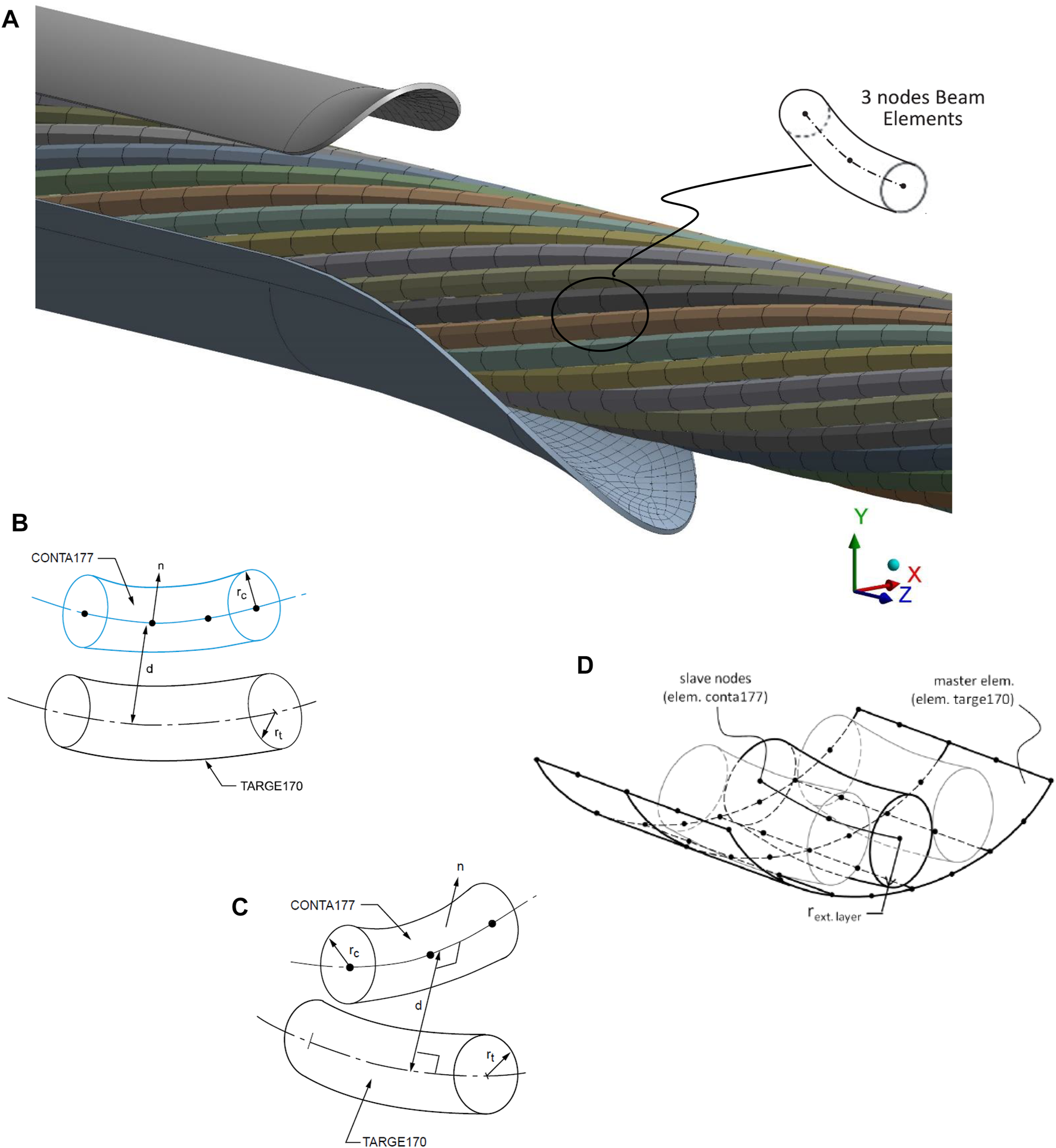 (A) Finite element mesh of the Bersfort conductor-clamp assembly showing the beam and rigid shell elements. (B) Line-to-line contact between the conductor wires of the same layers modeled with slave element CONTA177 and master element TARGE170. (C) Line-to-line contact between the conductor wires of different layers modeled with slave element CONTA177 and master element TARGE170. (D) Line-to-surface contact between the layer 4 wires and the keeper/clamp.