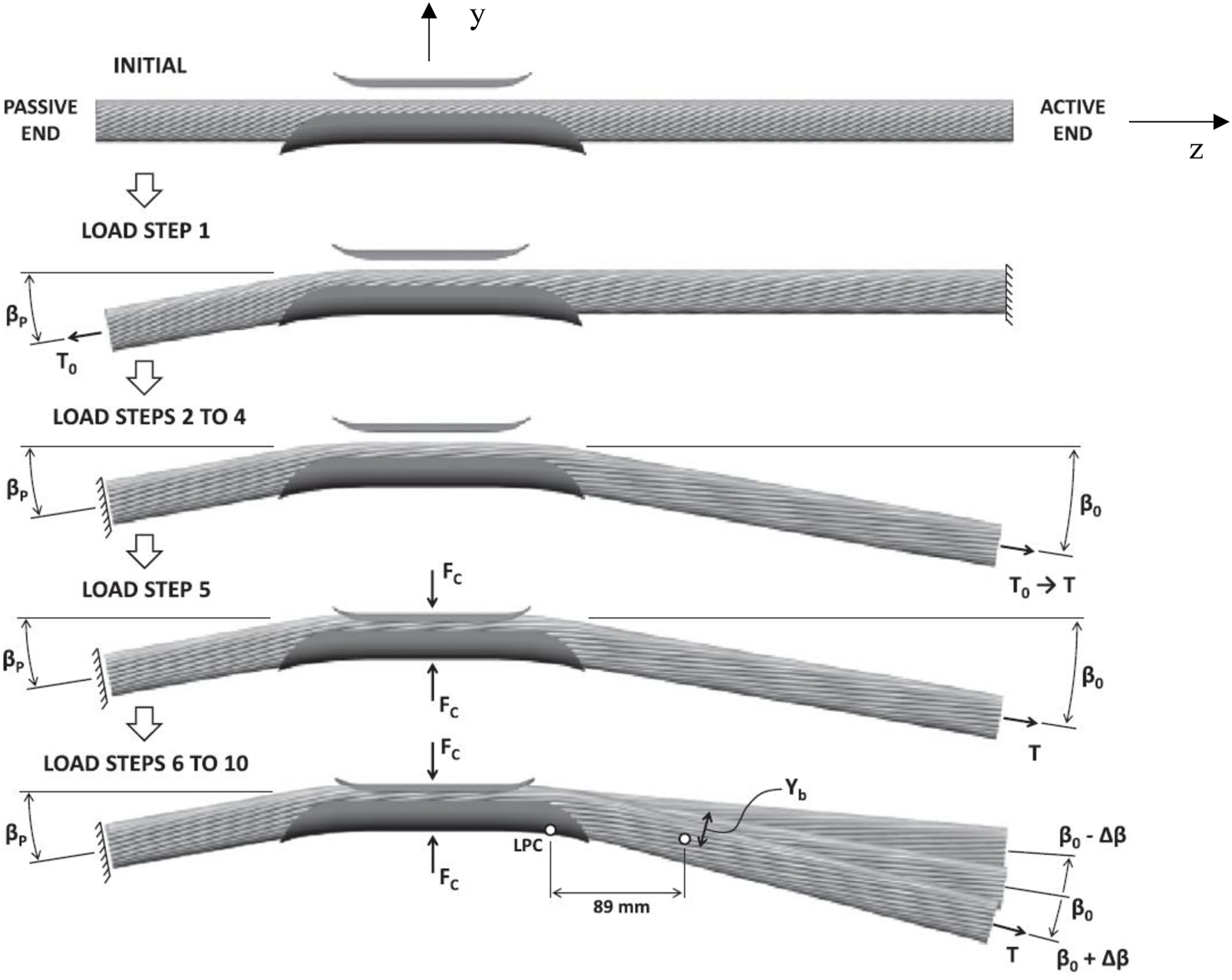 The first step of the loading protocol is to incrementally apply an initial tension at the passive end of the conductor at an angle relative to the horizontal while the active end of the conductor is restrained for all 6 DOFs (Figure 5). At the end of step 1, the passive end is fixed at its current position and the z-direction and y-direction displacement DOF at the active end is released; this is followed by the application of the conductor tension at the master node of the active end at an angle (step 2 in Figure 5). During the loading steps 3 and 4, the conductor tension at the active end is increased from to . The effect of the clamping force is simulated by introducing a force in the y-direction on the keeper master node in loading step 5. Once the clamping force is completely applied, it is replaced by the displacement induced by . The loading steps 6 to 10 consist in cycling the angle of the active end of the conductor with tension T by to induce a displacement . The value of is specified to match the target bending amplitude . The loads and angles corresponding to the experimental setup are provided in Table 2. Additional details can be found in Lalonde et al. (2018) and Levesque (2005).