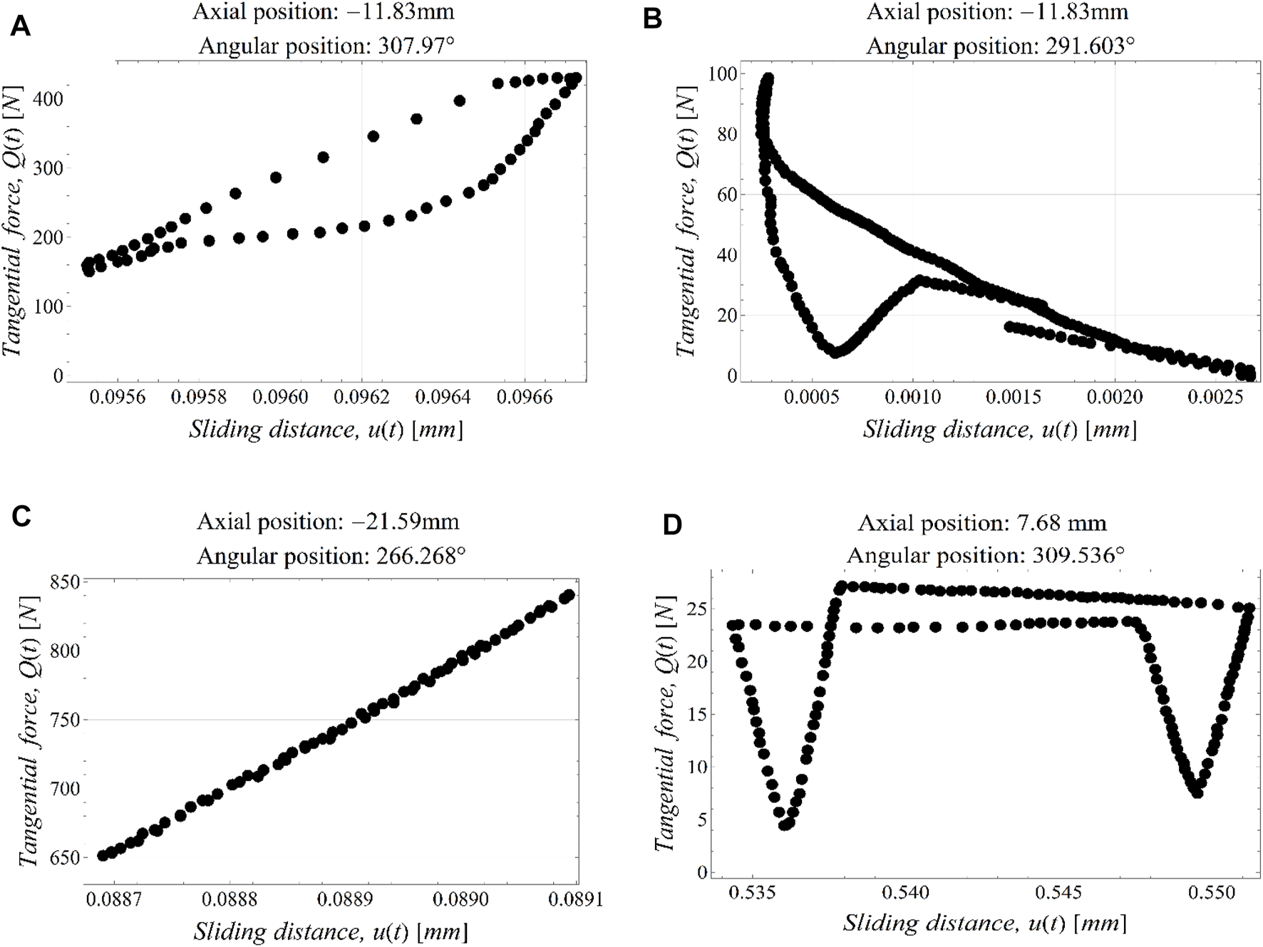 Examples of fretting regimes indicated by the plot of Q(t) against u(t) when the conductor goes through β0 ± Δβ for a bending amplitude of 0.75 mm. (A) Mixed fretting regime on a layer 4 to layer 3 contact. (B) Mixed fretting regime on a layer 4 to clamp contact. (C) Sticking contact on a layer 4 to layer 3 contact. (D) Gross slip contact on a layer 4 to contact.