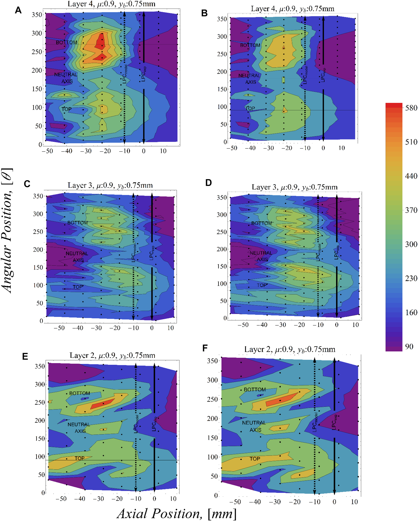 Distribution of maximum principal stresses (in MPa) for a bending amplitude of 0.75 mm. (A,C,E)β0 + Δβ and (B,D,F)β0 − Δβ.