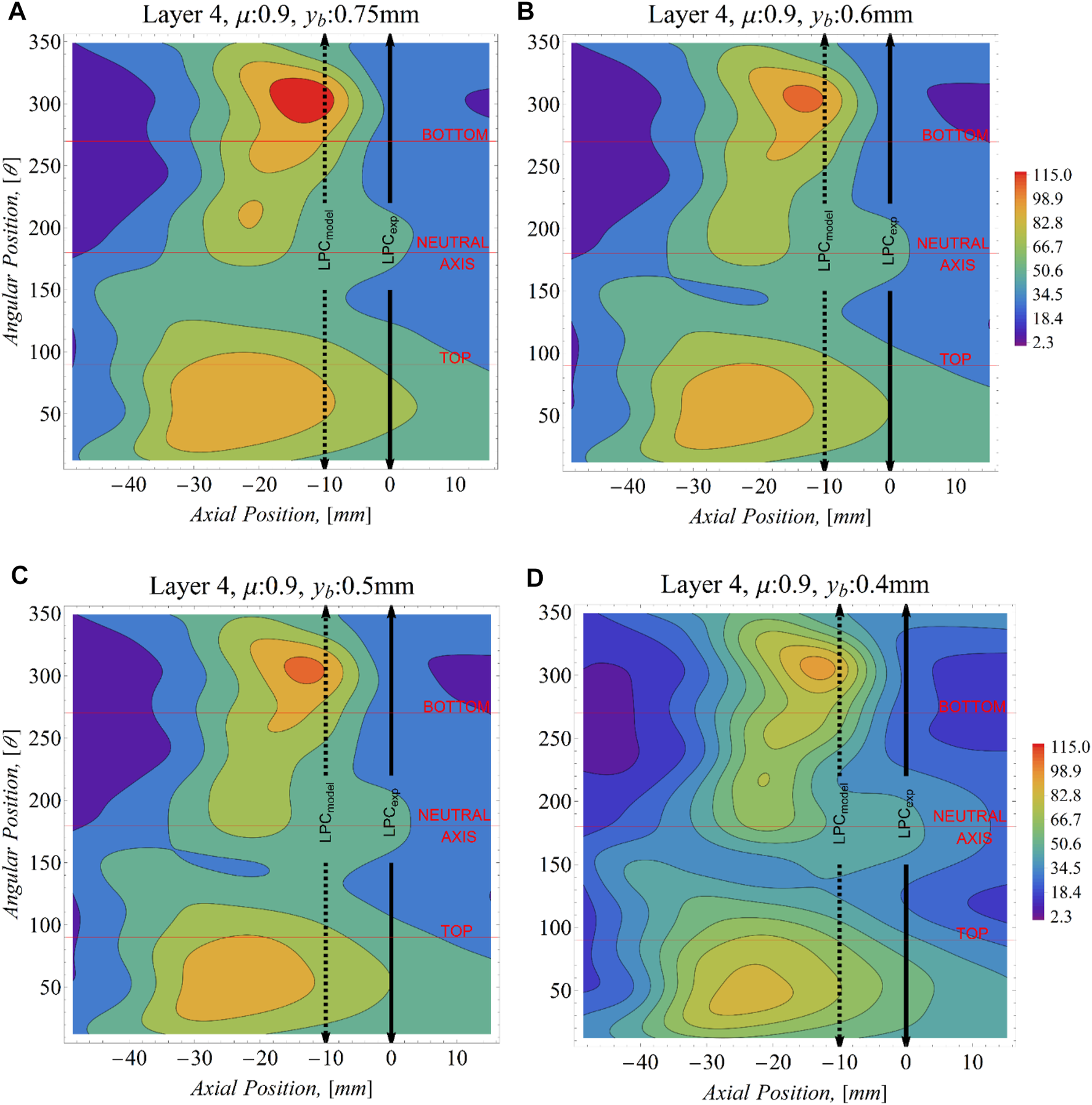 Maximum SWT distribution on the wires of layer 4 of the Bersfort conductor. (A) bending amplitude of 0.75 mm. (B) bending amplitude of 0.6 mm (C) bending amplitude of 0.5 mm (D) bending amplitude of 0.4 mm. Units of the SWT are in MPa.