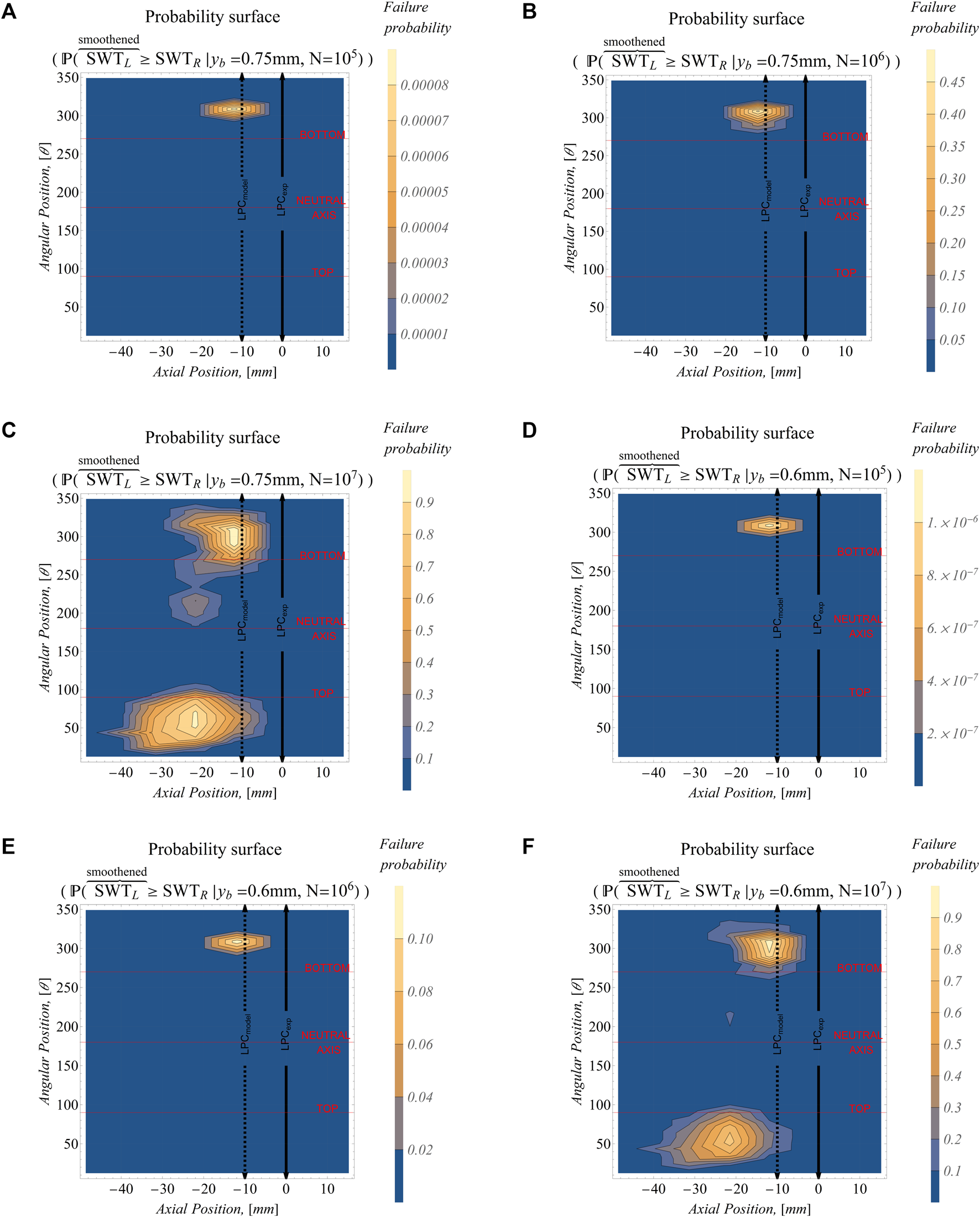 Probability of failure for the wires in layer 4 of the Bersfort conductor at a bending amplitude of 0.75 mm (A–C) and 0.6 mm (D–F).