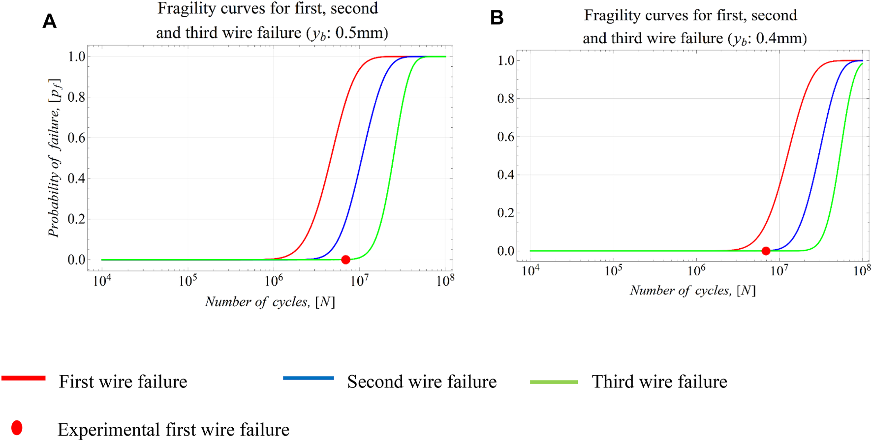 Fragility curves for the Bersfort conductor at a bending amplitude of (A) 0.5 mm and (B) 0.4 mm.