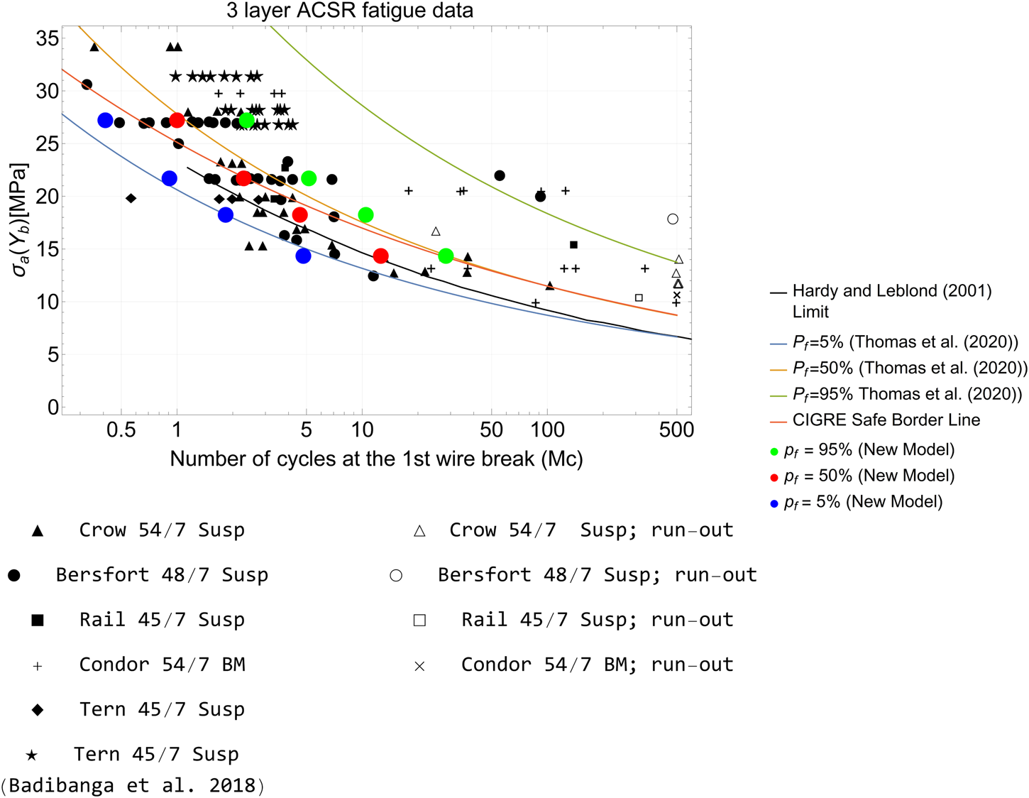 For large amplitudes (0.75 mm), the median predicted life from the proposed model is close to the median curve proposed by Thomas et al. (2020). It is also noted that the CIGRE-CSBL is not a safe border line since it is above the 5% probability of failure predicted by the new model. Such a limitation of the CIGRE-CSBL has also been noted by Hardy and Leblond (2001). The results of the new model also show that the safe limit of Hardy and Leblond (2001) is also above the 5% probability of failure predicted by the new model and the model of Thomas et al. (2020).