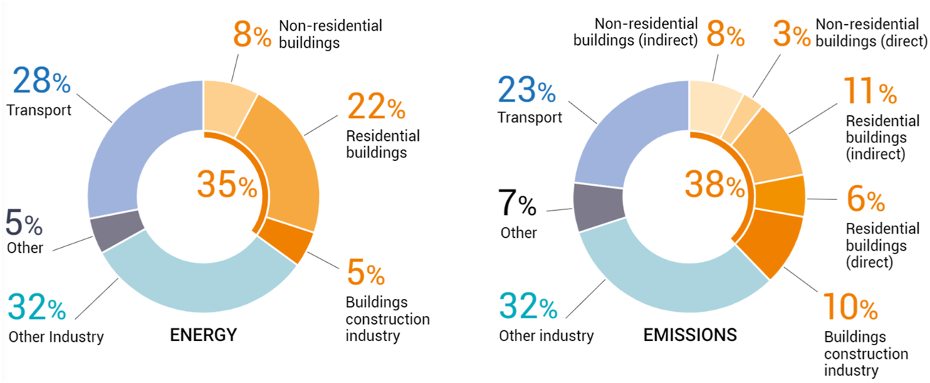 Global share of buildings and construction final energy and emissions, 2019. Figure obtained from (lobalnvironmen, 2020).