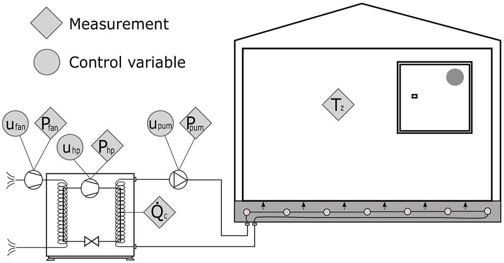 In Eq. 1e and the time dependency has been omitted for clarity because all variables are time-dependent except the vector of model parameters p, and the weighting factor w, the latter being used to account for the different orders of magnitude between energy cost and discomfort . The energy cost is the first term of the objective function where all elements accounting for electrical power are summed and multiplied by the electricity price pe. These are the heat pump power Php, the evaporator fan power Pfan, and the circulation pump power Ppum. T represents the vector of non-measured temperature states of the controller model. The discomfort is defined as the deviations of Tz out of the comfort range bounded by and . The weighting factor w is tuned to penalize more heavily the instantaneous discomfort than the instantaneous energy cost, such that the thermal discomfort is treated as a soft constraint in the optimization.