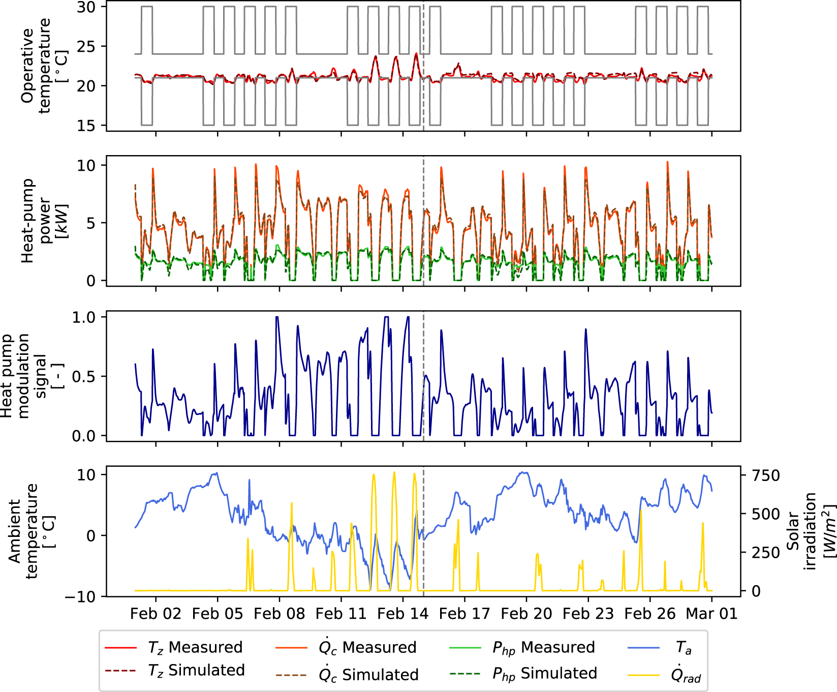 The model has a total of 20 lumped parameters that need to be estimated. The parameter estimation process is carried out with the Grey-Box Toolbox (De Coninck et al., 2016). Two weeks of data are generated by the emulator with the baseline controller for training, and 2 weeks are used for validation of the model. The fitting variables are the zone operative temperature Tz, the heat pump condenser thermal power and the heat pump electrical power use Php. The last two variables determine the coefficient of performance of the heat pump. The model further consists of three inputs: ambient temperature Ta, solar irradiation , and occupancy gains . Figure 4 shows an overview of the training and validation periods that have been selected not to overlap any of the testing periods.