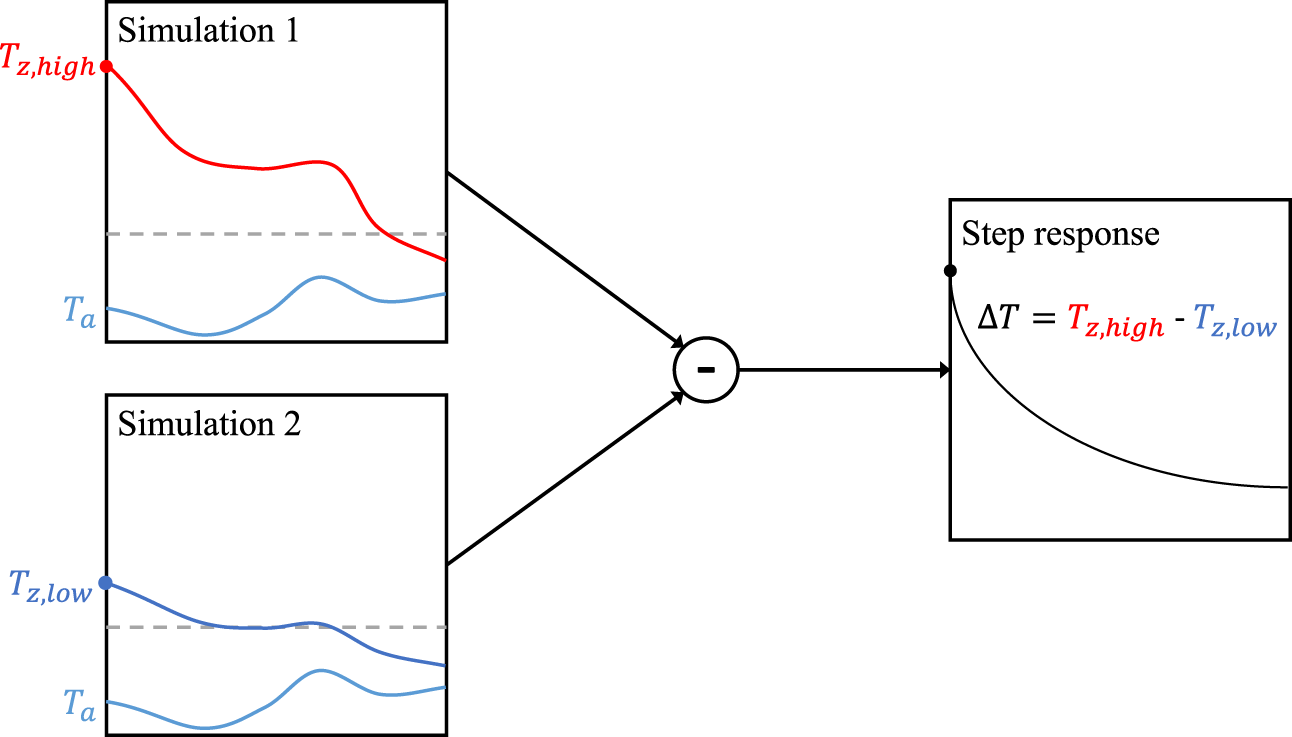The process of calculating the step response by filtering out the effect of the continuously changing boundary conditions is schematically depicted in Figure 5. In this figure, Tz,high represents the zone operative temperature of the simulation that starts at a higher thermal state, Tz,low represents the zone operative temperature of the simulation that starts at a lower thermal state, and Ta is the ambient temperature.