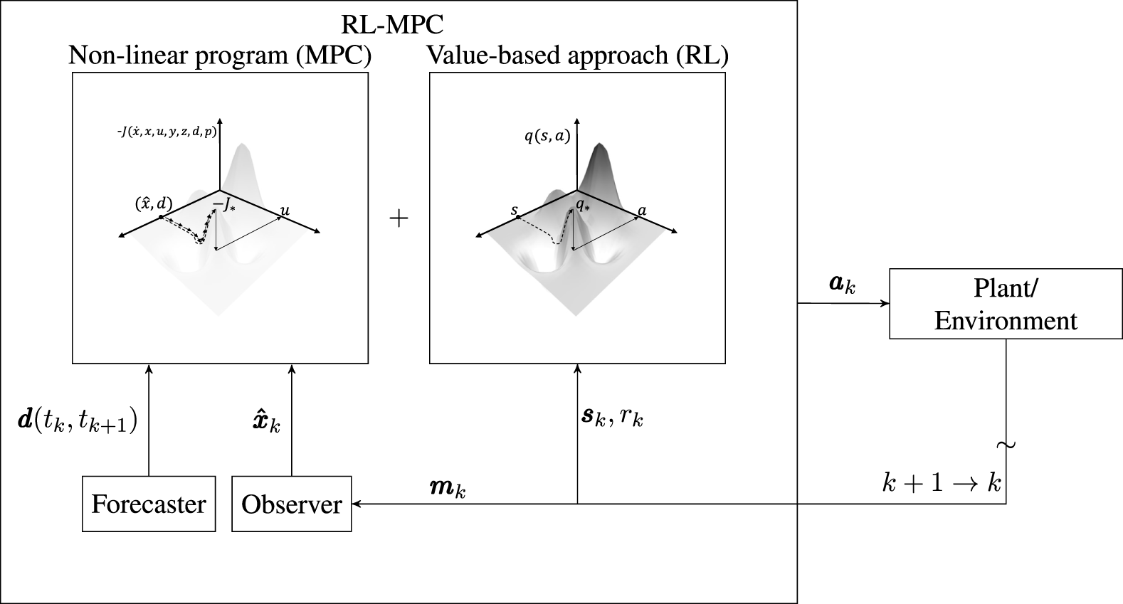 The RL-MPC algorithm, as described in Arroyo et al. (2022) is also implemented for each of the testing scenario periods. We refer to Arroyo et al. (2022) for details about the algorithm and its implementation, but provide here a brief description for clarity. A high-level representation of the RL-Algorithm is shown in Figure 6, where k is the control step index, m is the vector of measurements, is the estimated state of the controller model, d is the forecasted set of disturbances, s is an agent’s observation, a is the action decided by the agent, and r is the obtained reward.
