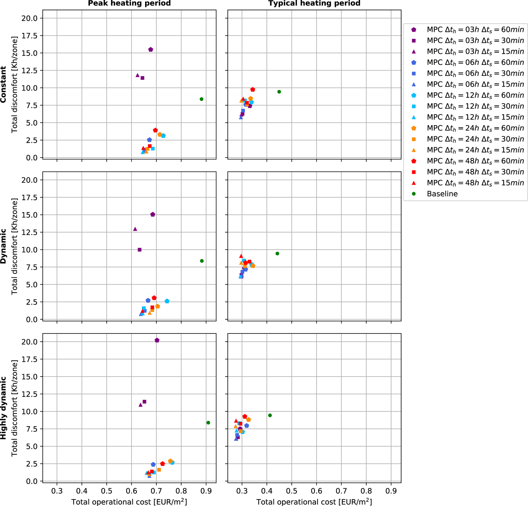 All six available case scenarios are considered in this paper when testing the controllers for a complete overview and evaluation. These scenarios arise from combining the two heating periods (peak and typical) and the three electricity pricing tariffs (constant, dynamic, and highly-dynamic). Each controller instance is tested in each of the 2-weeks scenario periods. The control objective is always the same: maximize comfort while minimizing operational cost. To this end, both the MPCs objective functions and the RL agents’ rewards are configured to weigh discomfort approximately one order of magnitude more than the operational cost at nominal conditions.