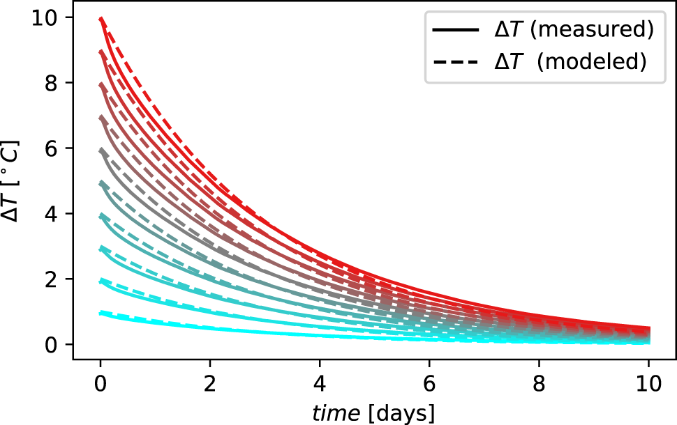 The time constant τ is estimated by fitting Eq. 1 to a given evolution of the temperature difference ΔT(t) from an initial temperature difference ΔTi that is artificially generated to emulate the step.