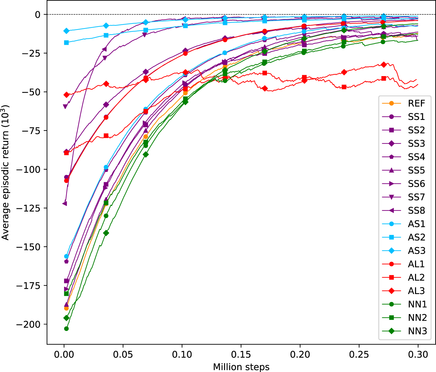 Three variations are explored from the network used in the reference case. The first variation (NN1) reduces the network to use only one hidden layer of 64 neurons. The second envisaged architecture (NN2) further decreases the size of the network by using only one hidden layer of 32 neurons. The third variation (NN3) uses the original network architecture but applies normalization to the intermediate layers. That is, the output of a layer is normalized to improve convergence during training. It is worth mentioning that the AL2 variant also required a reduction of the size of the network architecture from the one used in the reference case (1 instead of 2 hidden layers). The reason is that the original network architecture made this agent diverge at early stage during the training process. All variations exploring the effect of different network architectures are marked green.