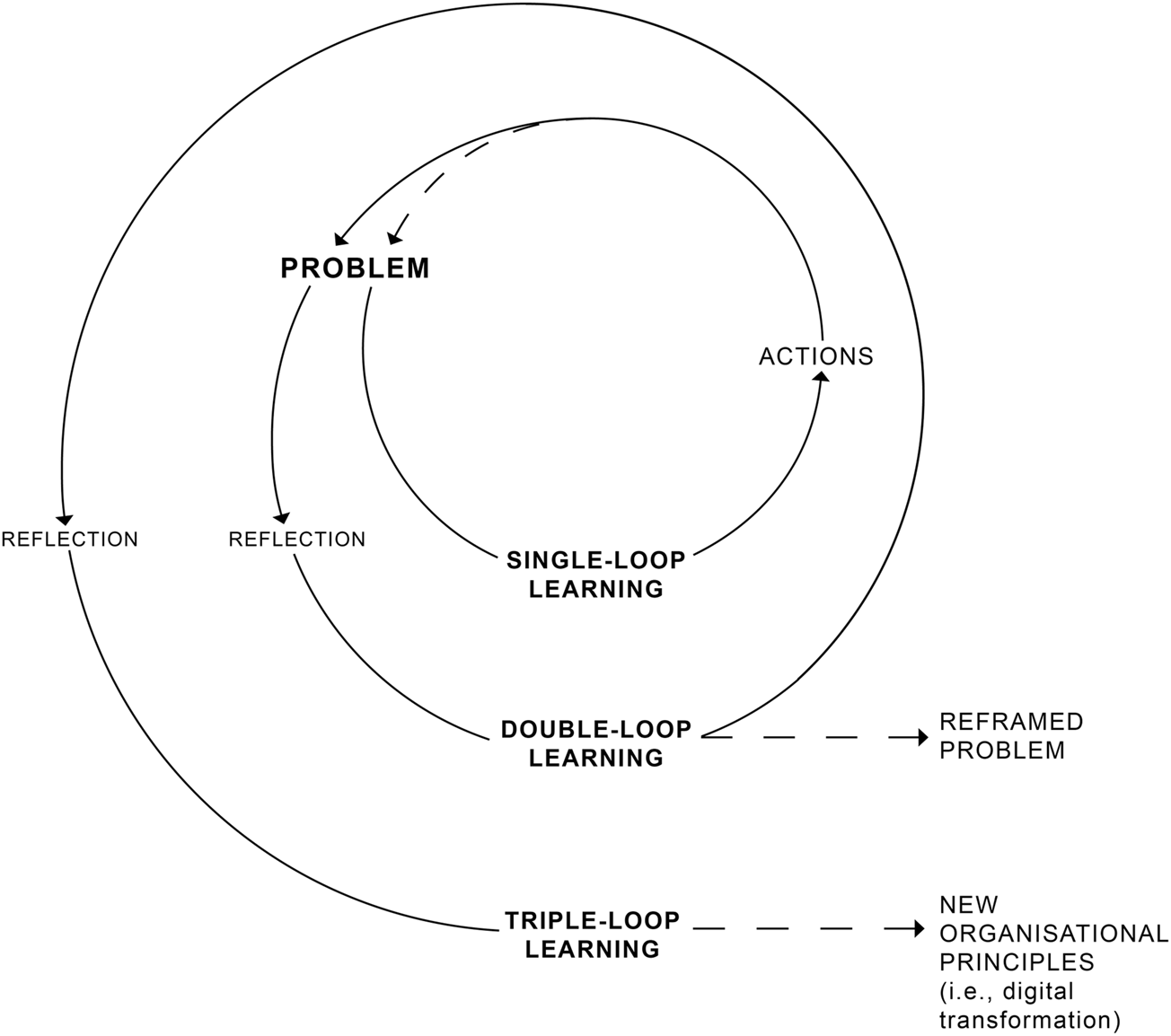 In single- and double-loop learning, organizations inquire and correct to prevent errors, but in triple-loop learning, organizations question “existing products, processes, and systems by strategically asking where the organization should stand in the future marketplace” (Wang and Ahmed, 2003, p.13). Triple-loop learning extends what is inferred by the concept of organizational learning as processes of knowledge acquisition, retention, transfer, and diffusion to knowledge creation that converts to radical innovation (Wang and Ahmed, 2003). Furthermore, triple-loop learning implies a deep form of learning that involves questioning and also “unlearning” extant ways of working (Wang and Ahmed, 2003; Tsang and Zahra, 2008; Loosemore, 2014; Tsang, 2017). In this way, triple-loop learning finds close alignment with definitions of DT as a process of radical value change creation in organizations (Table 1).