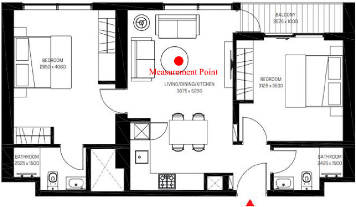 The three selected homes represent varied temperature control types (autonomous, artificially controlled, and constant temperature), indoor layouts, and floor levels (VR – 12th floor, TA – 16th floor, TB – 15th floor). At the same time, all maintain a uniform area of 87 m2. This selection was deliberate to ensure environmental comparability while allowing analysis of distinct microclimate conditions. These homes were part of the same development and constructed approximately 30 days before their expected occupancy approval date, aligning with Dubai Municipality’s air quality inspection timeline (Singer et al., 2020).