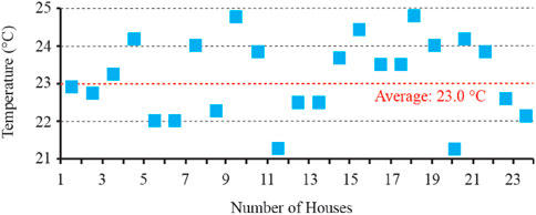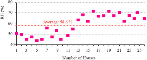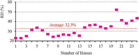 Figure 4 illustrates the distribution of indoor temperatures for 24 houses measured during winter, specifically during the period of artificial adjustment. The average temperature recorded was 23.0 °C, with a Standard Deviation (SD) of ±1.1, within a temperature range of 20.8 °C–24.7 °C. Figure 5 displays the distribution of Relative Humidity (RH). The average humidity observed was 32.3%, with an SD of ±7.0, spanning a distribution range of 23.3%–51.3%.