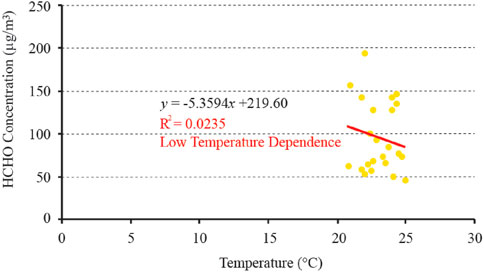 Figure 6. Temperature and HCHO Relationship in Winter (Artificial Control). Scatter plot showing no significant correlation between indoor temperature and HCHO concentration (R2 = 0.02, p > 0.05, Wilcoxon signed-rank test).