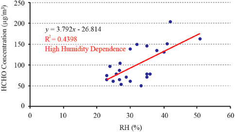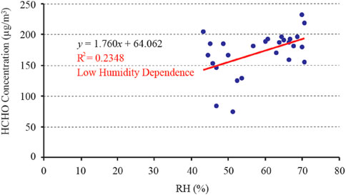 Figure 7. Humidity and HCHO Relationship in Winter (Artificial Control). Scatter plot showing a moderate positive correlation between humidity and HCHO (R2 = 0.43, p < 0.05, Wilcoxon signed-rank test).
