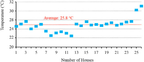 Figure 8 showcases the indoor temperature distribution during the summer measurement period for 26 houses. The average temperature recorded was 25.8 °C, with a standard deviation of ±2.0, ranging from 22.6 °C to 31.2 °C. The humidity ranged from 45.0% to 71.0%, with an average humidity of 58.6% and a SD of ±9.8 (Figure 9).