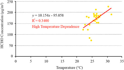 Table 2 summarizes temperature, humidity, and HCHO dependence across control conditions, highlighting seasonal and methodological variations. In this section, we analyze the emission characteristics of HCHO with variations in temperature and humidity. The data for this analysis were obtained from measurements taken 30 days before occupancy in newly constructed houses from 2021 to 2023.