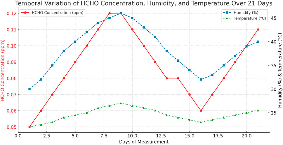 Figure 12. Temporal Variations in HCHO Concentration, Humidity, and Temperature Over 21 Days. Time-series plot showing significant daily variation. Peaks in HCHO correspond to low humidity levels. ANOVA confirmed temporal significance (p < 0.01).