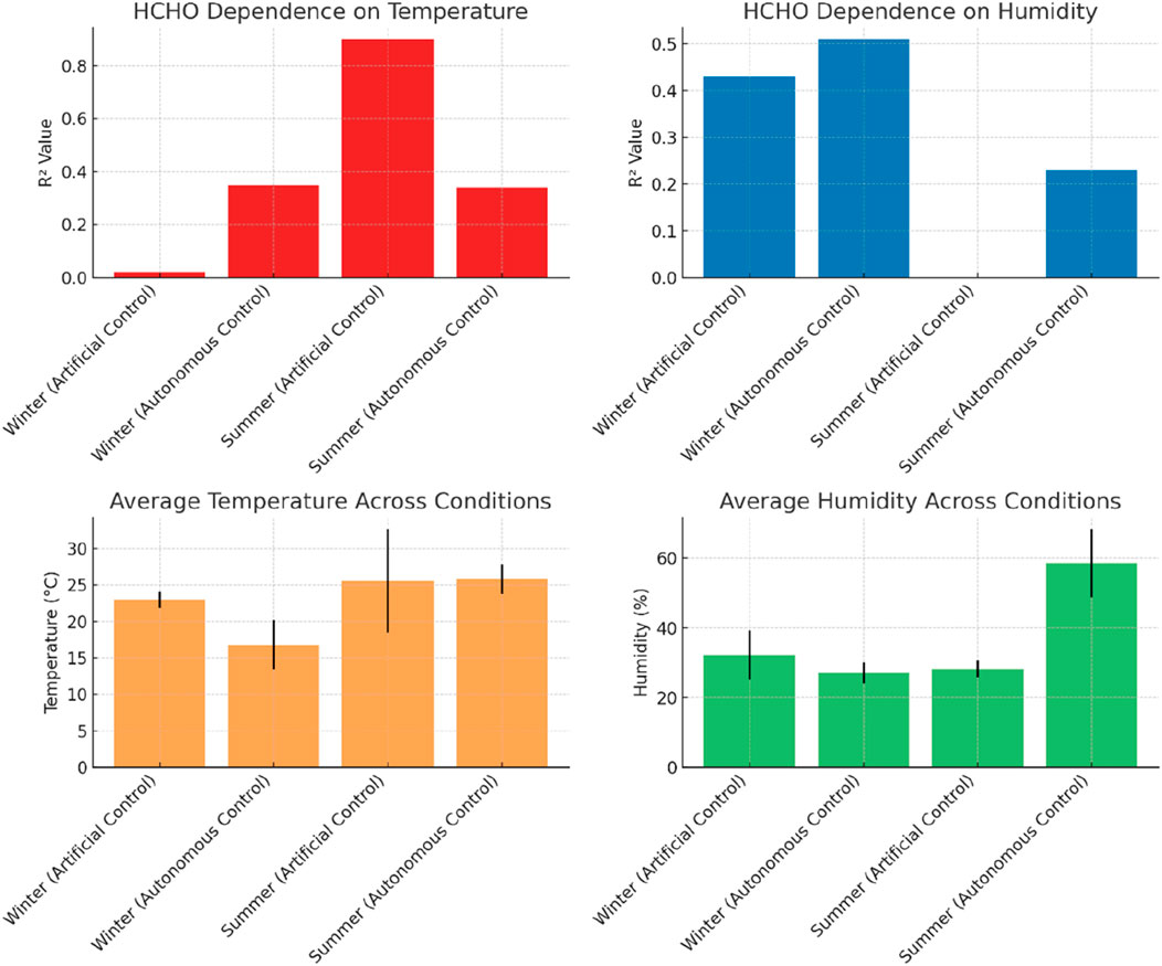 Figure 13 presents a comparative analysis of temperature, humidity, and HCHO dependency across different seasonal and control conditions. The results highlight key emission trends, with HCHO showing a stronger dependence on temperature in summer and humidity in winter, reinforcing the need for adaptive IAQ management strategies.