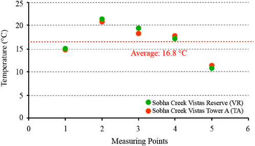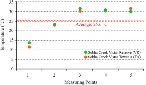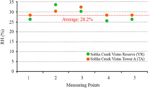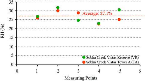 There is minimal disparity in indoor temperature and humidity distribution between Sobha Creek Vistas Reserve (VR) and Sobha Creek Vistas Tower A (TA). The temperature ranges from 11.1 °C to 21.5 °C, with an average of 16.8 °C and a standard deviation of ±3.4 (Figure 18). Regarding humidity, it ranged from 23.0% to 32.0%, with an average of 27.1% and a standard deviation of ±3.0 (Figure 19).