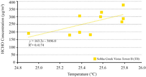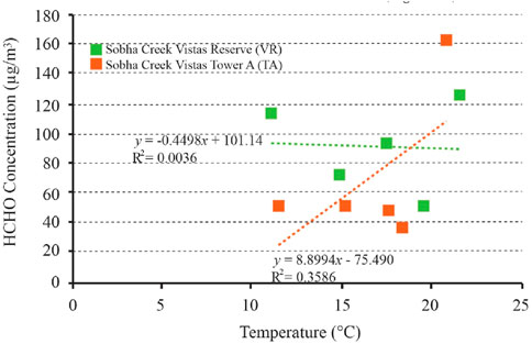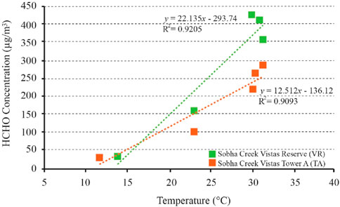 The emission characteristics of HCHO were categorized into an artificial control section, where a temperature increase was artificially induced, and an autonomous temperature control section, where a natural temperature decrease occurred. These sections were analyzed to determine the release patterns of HCHO. Furthermore, temperature, humidity, and HCHO measurements were conducted over 21 days for Sobha Creek Vistas Reserve (VR) and Sobha Creek Vistas Tower A (TA).