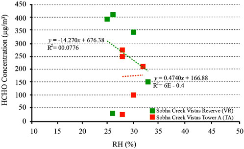 Figure 17. RH and HCHO Relationship at VR and TA House in the Artificial Control (Multi-Measurement). No significant correlation found (R2 = 0.00, p > 0.05, Mann–Whitney U test).