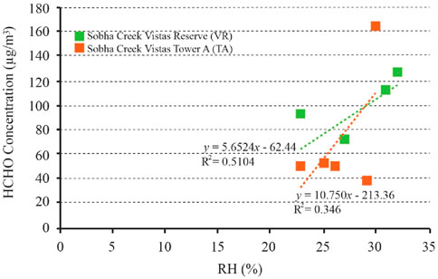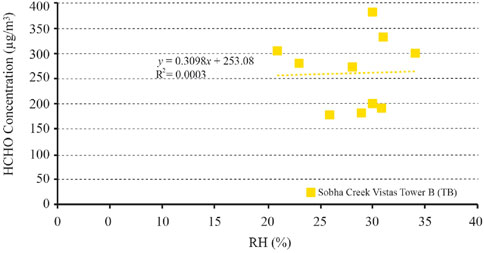 In this section, as shown in Figures 20, 21, variations are observed between the houses. Sobha Creek Vistas Reserve (VR) does not exhibit a linear temperature-dependent trend. In contrast, Sobha Creek Vistas Tower A (TA) displays an R2 value of 0.35, indicating a tendency for HCHO emission to be influenced by temperature. Conversely, for humidity, the R2 value for Sobha Creek Vistas Reserve (VR) was 0.51, while for Sobha Creek Vistas Tower A (TA), it was 0.34. Both Sobha Creek Vistas Reserve (VR) and Sobha Creek Vistas Tower A (TA) consistently demonstrated a dependence on humidity in the self-temperature-controlled section. Under conditions where the temperature remains below 25 °C, the dependence of HCHO release on temperature weakens, while the reliance on humidity remains relatively high and consistent.