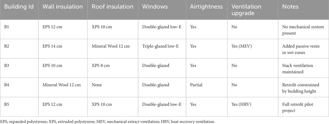 A summary of the retrofit interventions for each building is provided in Table 1, detailing insulation materials, window types, ventilation upgrades, and airtightness improvements.