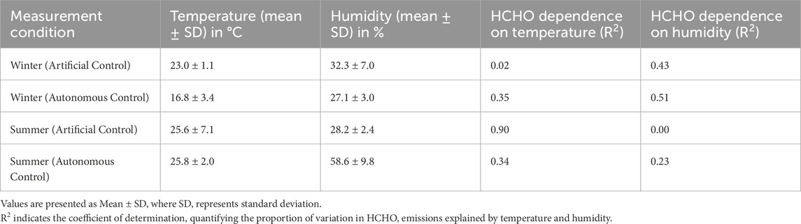 The findings from these measurements provide insight into how environmental factors influence HCHO emissions, aiding in the development of targeted mitigation strategies. These results suggest that controlling humidity in winter and temperature in summer may be critical in minimizing formaldehyde exposure in residential environments.